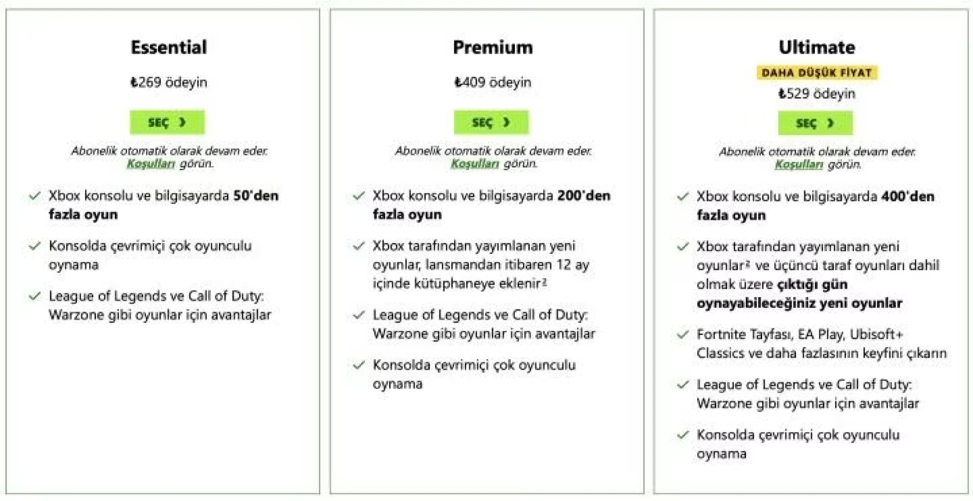 İndirimin en dikkat çeken kısmı Ultimate paketinde karşımıza çıkıyor. Daha önce 799 TL seviyesinde olan bu paket, yüzde 33 oranında bir indirimle 529 TL'ye iniyor. PC için Game Pass ise 449 TL'den 419 TL'ye düşüyor. Game Pass Premium ve Essential paketlerinde ise herhangi bir değişiklik görmüyoruz; bu iki paket fiyatlarını koruyor.