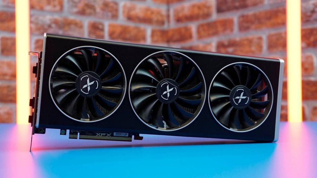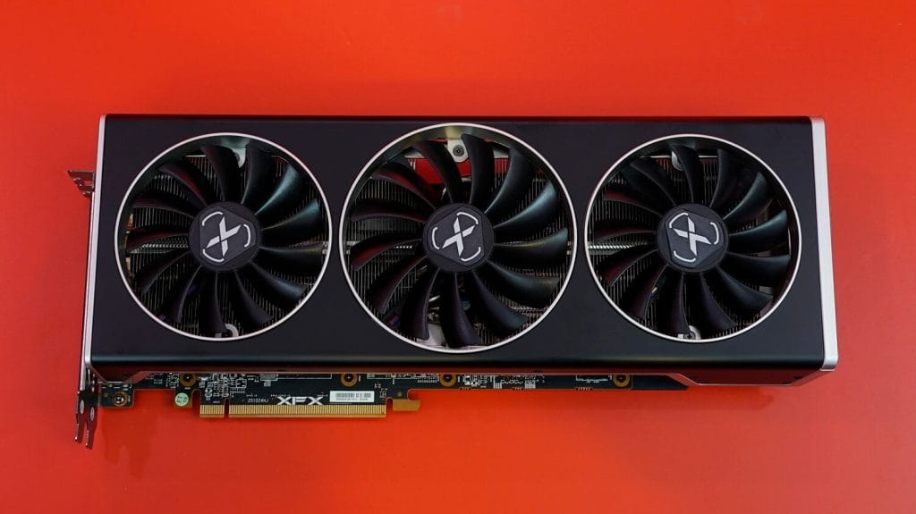 AMD tarafında ise Founders Edition olarak nitelendirilen modelin ise aşağıda resmi bulunuyor. Model tasarımı tanıdık gelebilir, çünkü önceki modellerine oldukça benziyor. Çift fanlı yapıda gelen ekran kartı, XFX’in aksine 8+6 pin girişine sahip.