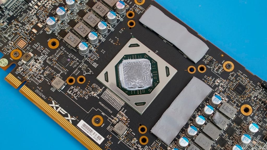 Kartın iç tasarımında alışılageldik bir dizayn görülüyor. VRAM belleklerin üzeri termal pedler ile kapatılırken, GPU’nun üzeri kaplanmış. GPU aslında kısa ancak XFX bloğu uzatabilmek için bir ek çıkarmış. Sıcak hava da buradan rahatlıkla dışarıya tahliye edilebiliyor.