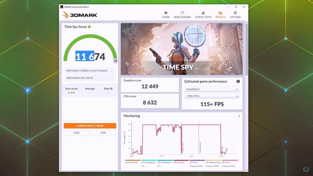Bu test sonucunda genel skor 11.674 olurken, ekran kartı 12.449 ve son olarak işlemci ise 8.632 puana ulaştı. Bu test süresi boyunca ekran kartının 61 dereceyi geçmediğini görüyoruz.