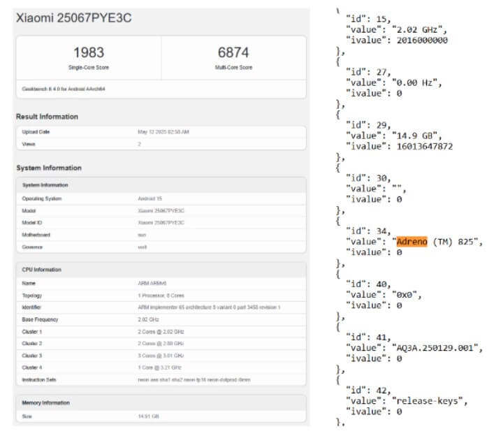 "Xiaomi 25067PYE3C" model numarası ile Geekbench veri tabanında listelendiği görünen cihazın, iddia edilen teknik detaylarından söz edecek olursak gücünü amiral gemisi
