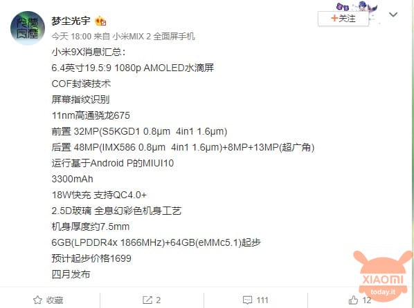 Xiaomi'nin yeni akıllı telefonu, 6.4 inç büyüklüğünde FULL HD+ AMOLED bir ekrana sahip su damlası adı verilen bir çentik ile beraber gelecek. Gücünü Qualcomm'un Snapdragon 675 yonga setinden alacak olan cihaza, 6GB LPDDR4x RAM ve 128GB dahili depolam alanı eşlik edecek.