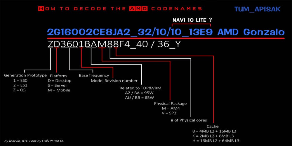 AMD 2G16002CE8JA2_32/10/10_12E9 kodu görüntülenen sızıntıda AMD'nin önceki nesil işlemcilerde kullandığı kodlardan yola çıkarak bir takım tahminlerde bulunuluyor. Buna göre işlemcinin 3.2GHz hızında çalışacağı ve 10_13E9 kodu ile de Navi 10 Lite tabanlı bir Radeon yongası taşıyacağı düşünülüyor.