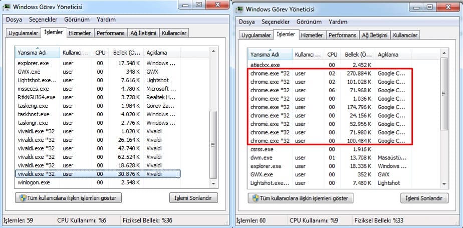 Ufak bir test yapacak olursak iki tarayıcıyı da aynı anda açtım ve kullanmış oldukları işlem ile kaç MB alana ihtiyaç duyduklarını çıkarttım. Sonuçlar Chrome ile kıyasla neredeyse iki kat daha düşük RAM kullanımlarını işaret ediyor. Yani Chrome bellekleri yerken, Vivaldi sadece ucundan koparıyor.