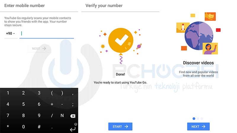 İlk olarak APK dosyasını yazımın altında bulunan linkten indirip, dışarıdan bir yazılım olduğundan gerekli izinleri sağlayarak yüklemeyi gerçekleştiriyoruz. Yükleme tamamlandığında YouTube Go uygulamamızı açıyoruz. Telefon numaramızı girip gerekli doğrulama adımını geçtikten sonra uygulama bizlere neler yapabildiğinden kısaca bahsediyor. Bu kısımlara göz atıp "Next" diyoruz ve kullanıma başlıyoruz.