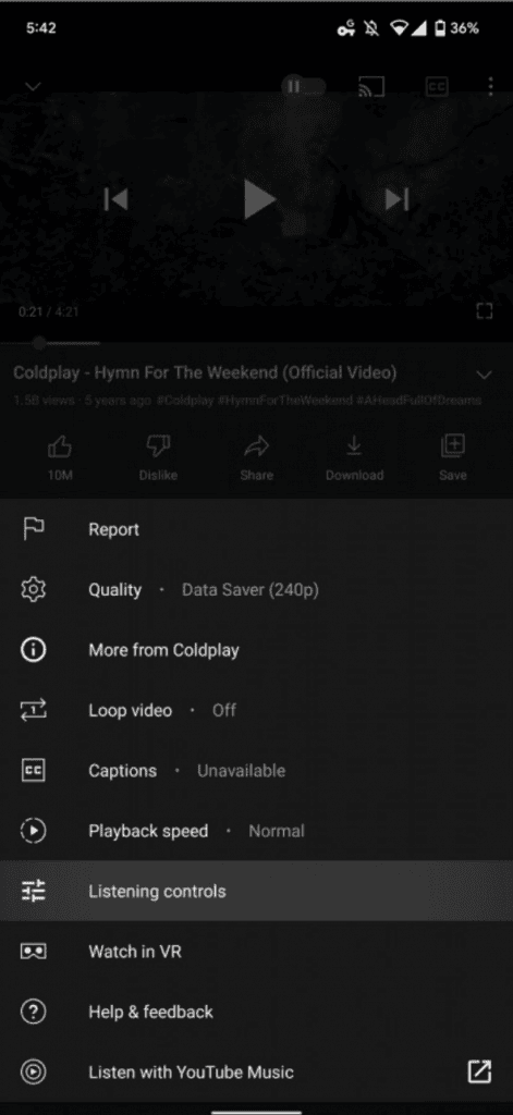 Dinleme Kontrolleri ile birlikte 10 saniyelik ileri ve geri sayma düğmelerinin yanı sıra oynat, duraklat ve önceki/sonraki videolar ile olağan kontrol setine sahip oluyorsunuz. Kontrol sayfasında ayrıca beğenme, kaydetme ve oynatmayı hızlandırma kontrolleri de yer alıyor.