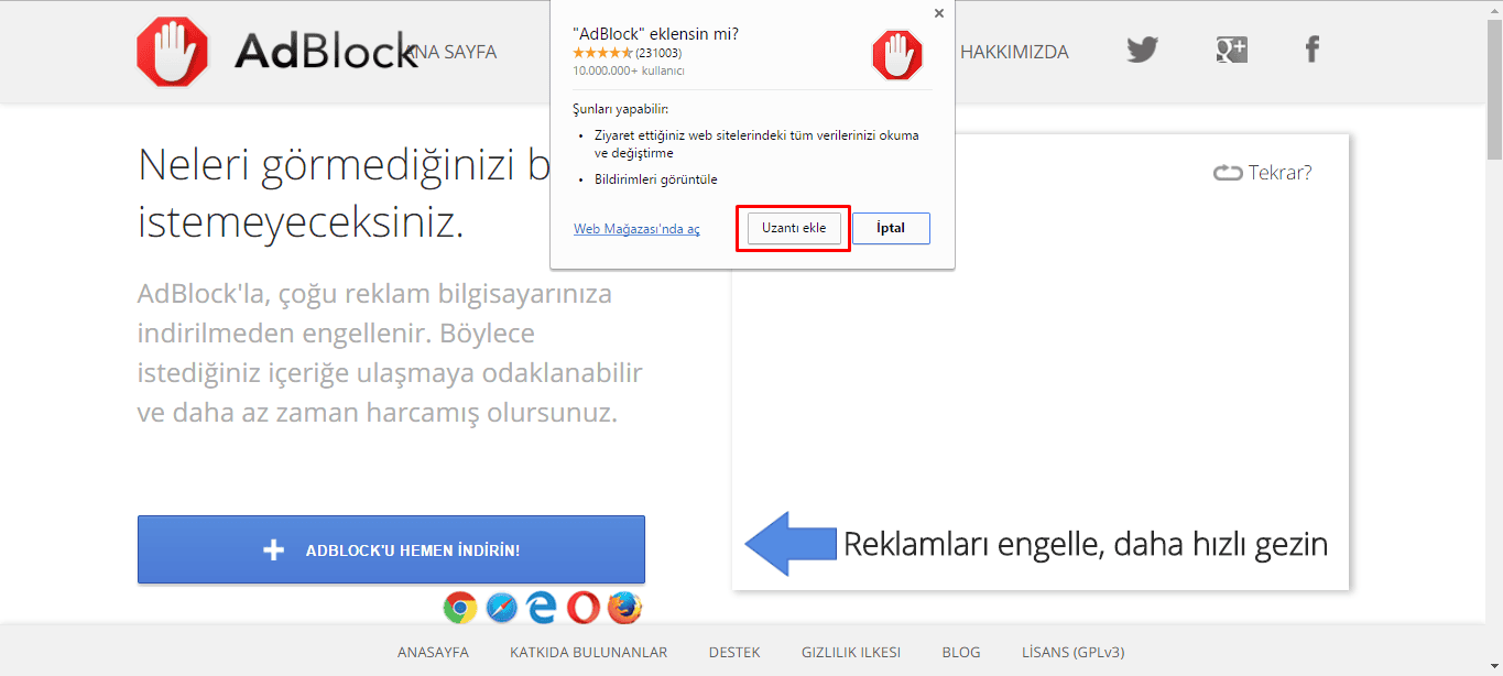 +AdBlock'u hemen indirin butonuna basalım.