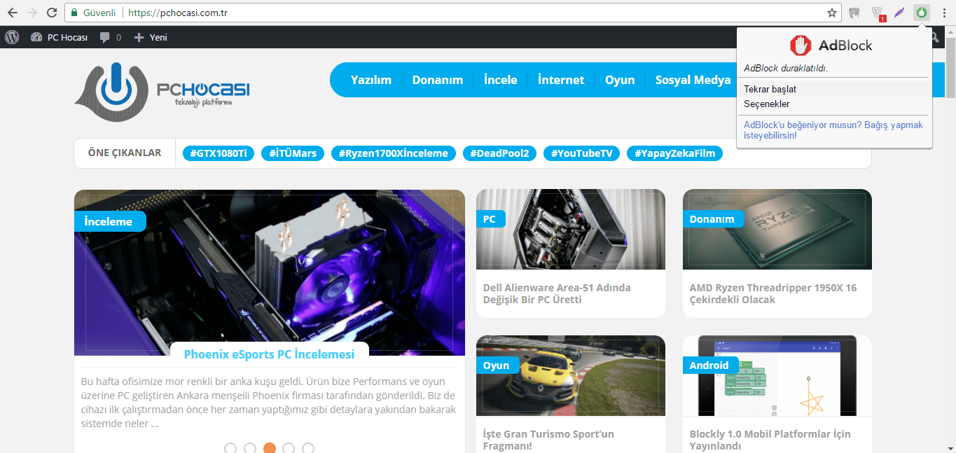 Sağ üst tarafta beliren eklentiyi açarak AdBlock'u başlat kısmına basalım. Bu kadar basit!