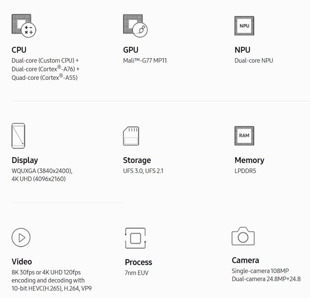 Samsung'un yeni amiral gemisi cihazlarında kullanacağı Exynos 990, 7nm'lik üretim aşamasından geçip 2 adet özel çekirdek, 2 adet Cortex-A76 çekirdeği ve 4 adet de Cortex-A55'i yapısında bulunduruyor. Mobil GPU olarak da Mali-G77'den gücünü alan işlemci, önceki sürüme göre %20 daha fazla performanslı. Dünya'da 5G teknolojisi çok yaygın olmasa da Samsung, yeni işlemcisinde bulunan Exynos Modem 5123 ile 5G desteğini sunuyor.