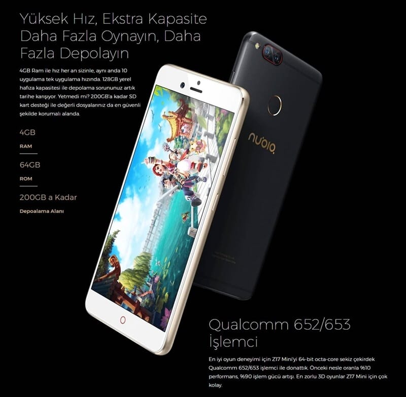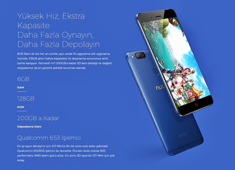 Piyasaya ilk sürülen Nubia Z17 Mini modeli Hindistan'dan sonra 2.ülke olarak Türkiye'de son kullanıcı ile buluşuyor. Şafak Mavisi olarak adlandırılan renk seçeneğinin yanı sıra, 6 GB RAM, 128 GB depolama alanı, Qualcomm Snapdragon 653 işlemci, üst seviye arka çift kamera (Bu konuda Sony'den destek alınarak IMX258 kullanılmış.) ve 16 MP ön selfie kamerası bulunuyor. Bu fiyat aralığında ise gerçekten büyük bir başarı olduğunun altını çizelim.